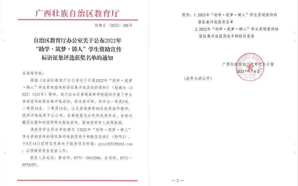 近日,2022年全区“助学·筑梦·铸人”学生资助宣传标语征集评选活动获奖名单公布,我校公共管理与传媒学院刘英杰同学的作品《助学以立其德,筑梦以塑其志,铸人以育其才》、商学院梁建丽同学的作品《续助学之火,亮筑梦之塔,耀铸人之路》分别荣获一等奖、三等奖,朱晓、王贤两位老师荣获优秀指导老师。