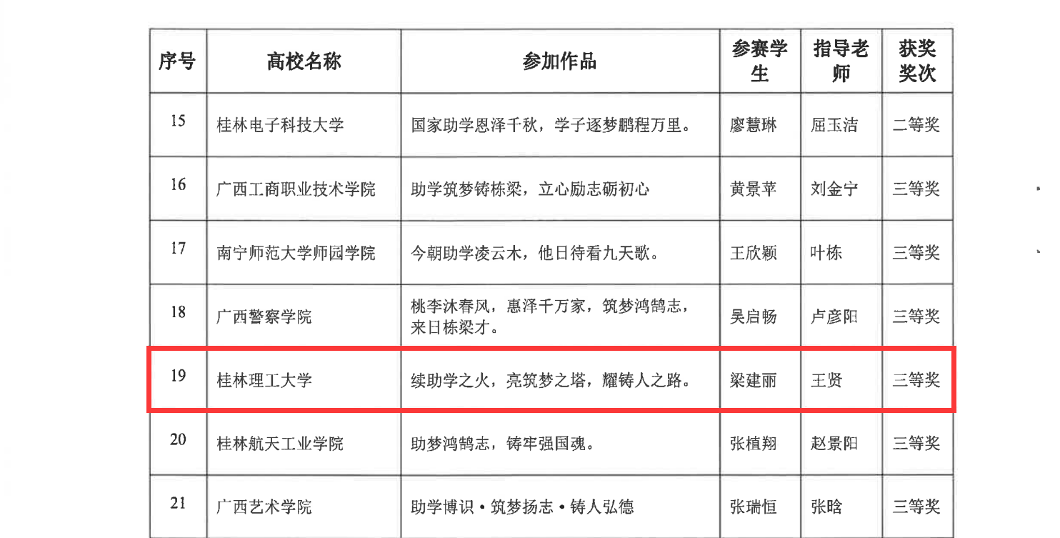 学校学生资助管理中心高度重视此次宣传标语征集评选活动,动员广大学生积极参与,经学院推荐、校内专家评审,择优报送作品到自治区教育厅参评。下一步,学校将不断加强学生资助政策和成效宣传,努力讲好学生资助故事,凝聚资助育人正能量,营造浓厚的资助育人文化氛围,激励广大桂工学子奋发自强、立志成才、诚实守信、感恩奉献。