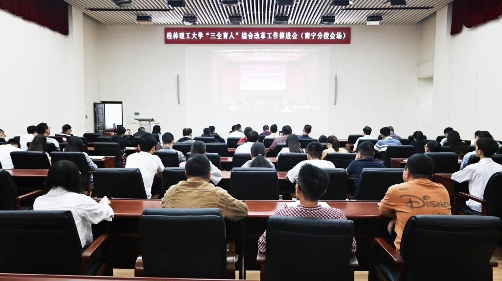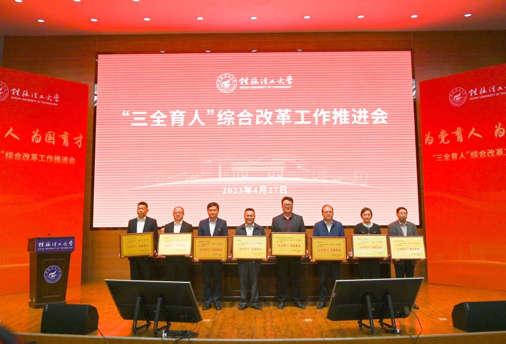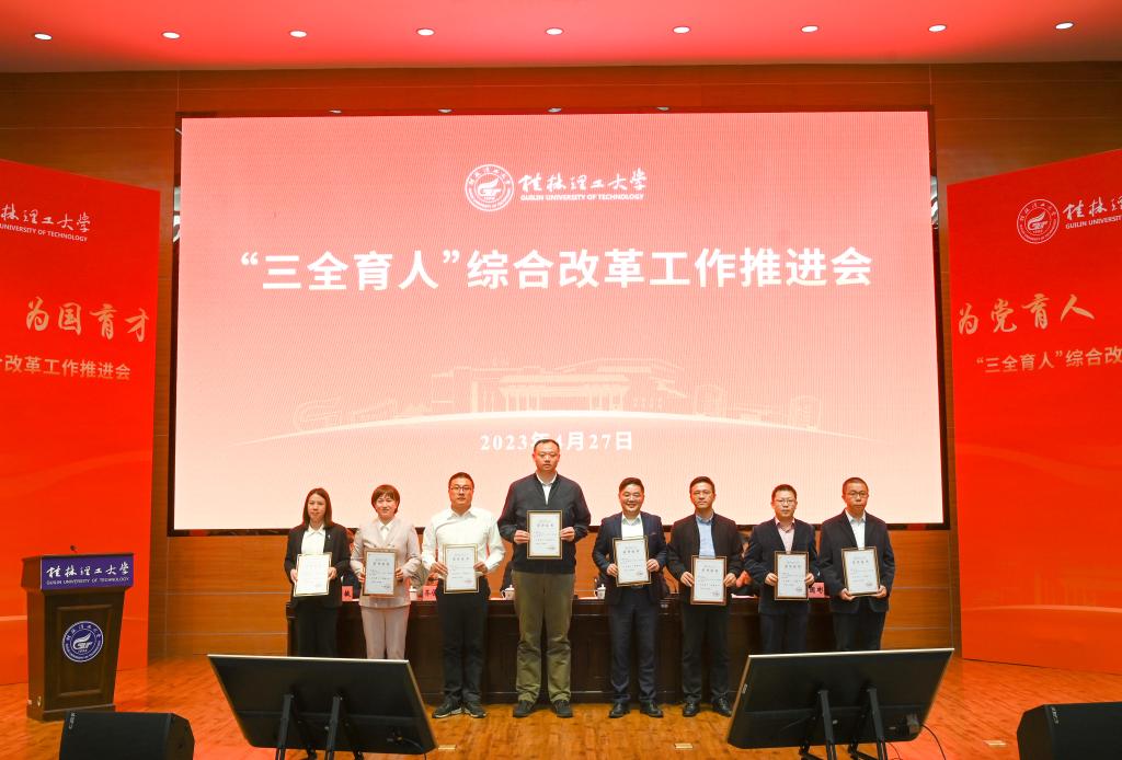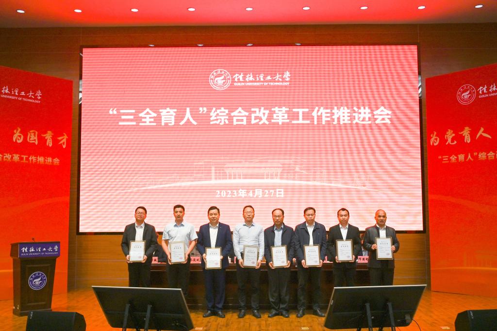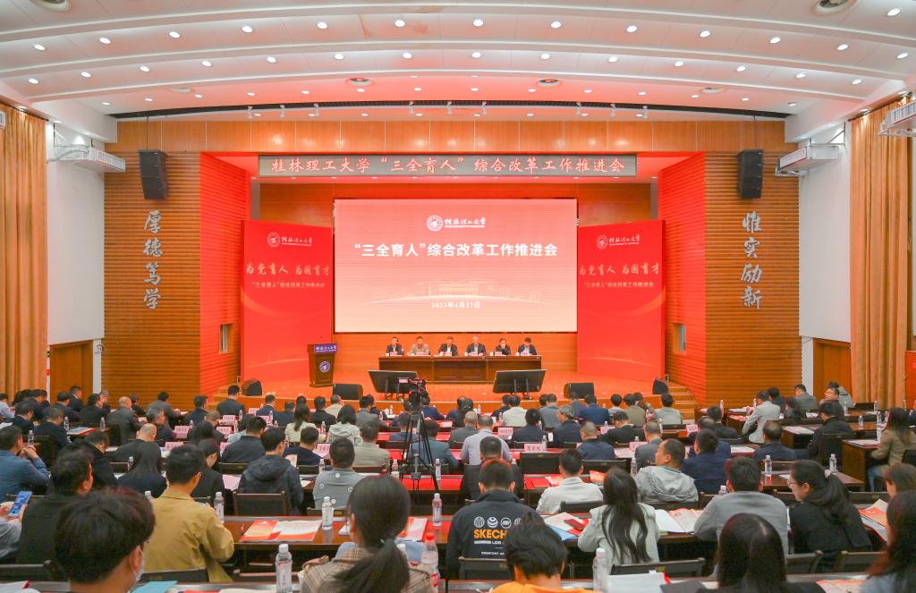 4月27日上午,我校在屏风校区图书馆报告厅召开学校“三全育人”综合改革工作推进会,深入学习贯彻习近平新时代中国特色社会主义思想和党的二十大精神,聚焦全面落实立德树人根本任务,总结工作,表彰先进,部署任务,进一步统一思想、凝聚力量,坚定不移把学校“三全育人”综合改革引向深入,推动学校育人工作高质量发展。学校党委书记邓军,党委副书记、校长王敦球,党委副书记齐俊斌、吴志强,党委常委、纪委书记韦学敏,党委常委、副校长邓国彬,党委常委唐壮东、叶昊,党委委员、校长助理辛立章、罗盛锋出席会议。