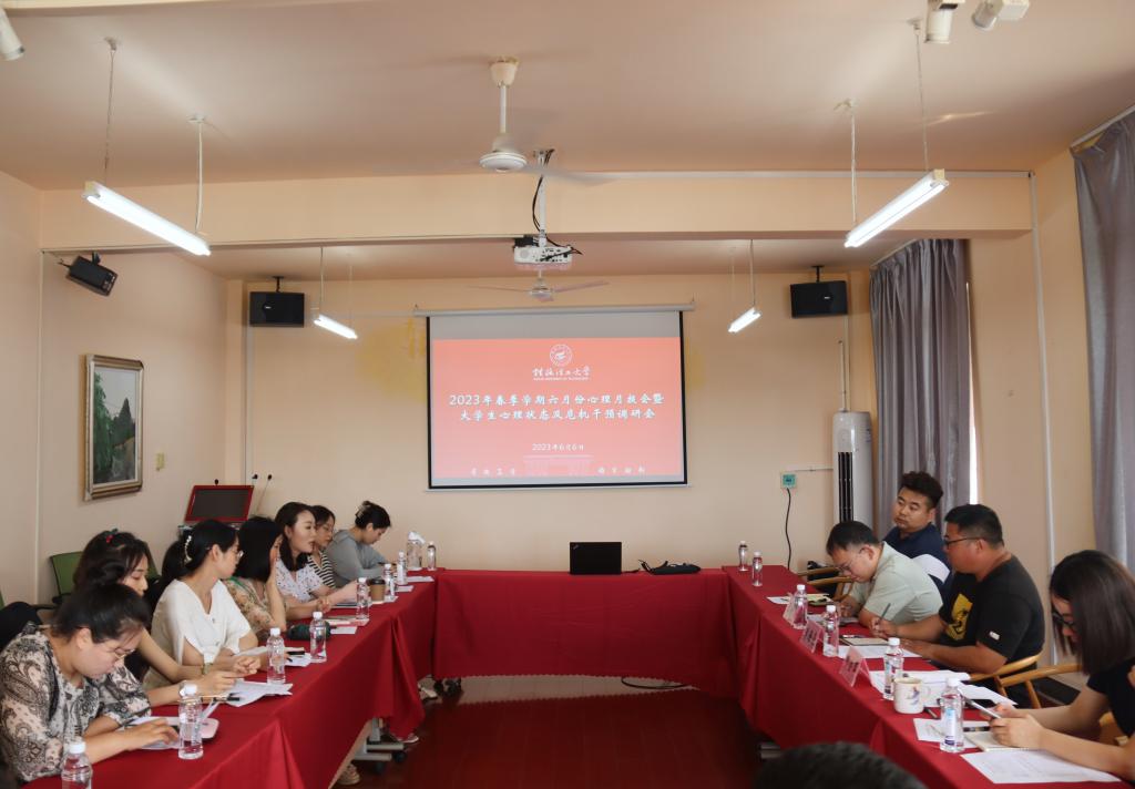 6月6日下午,2023年春季学期六月份心理月报会暨大学生心理状态及危机干预调研会议在雁山校区心理中心303召开,我校大学生心理中心老师、各学院负责心理健康教育专项工作的辅导员参加会议,心理中心主任李海亮主持会议。