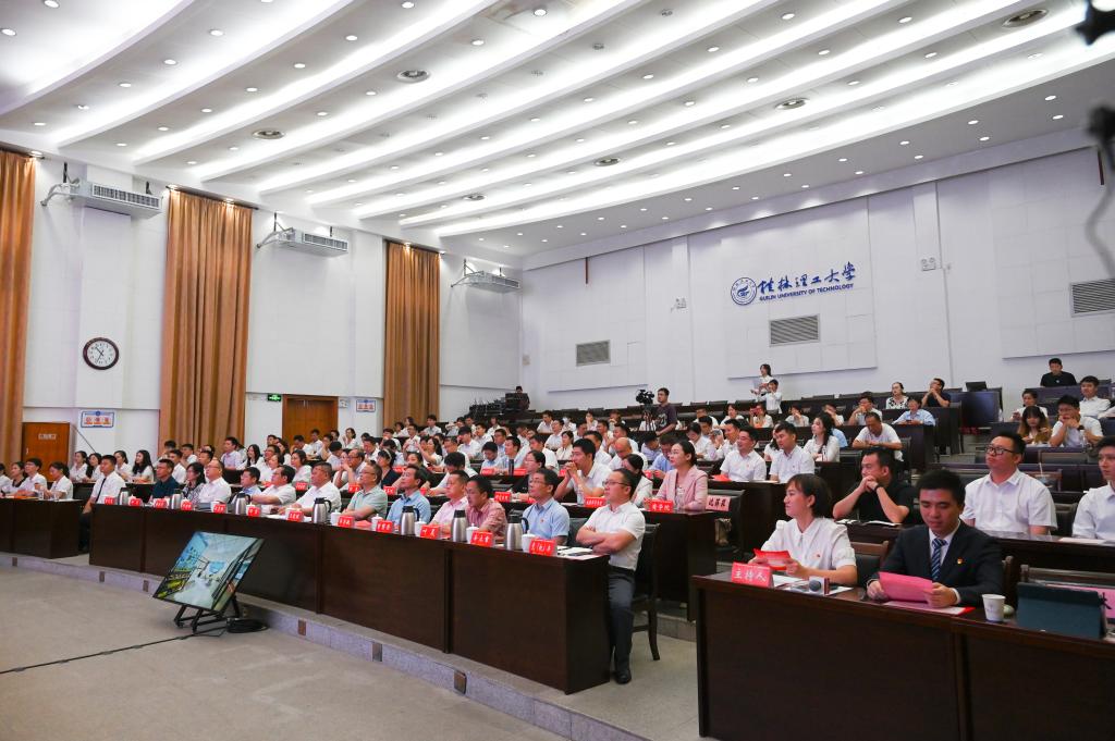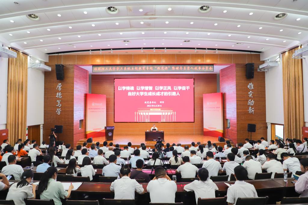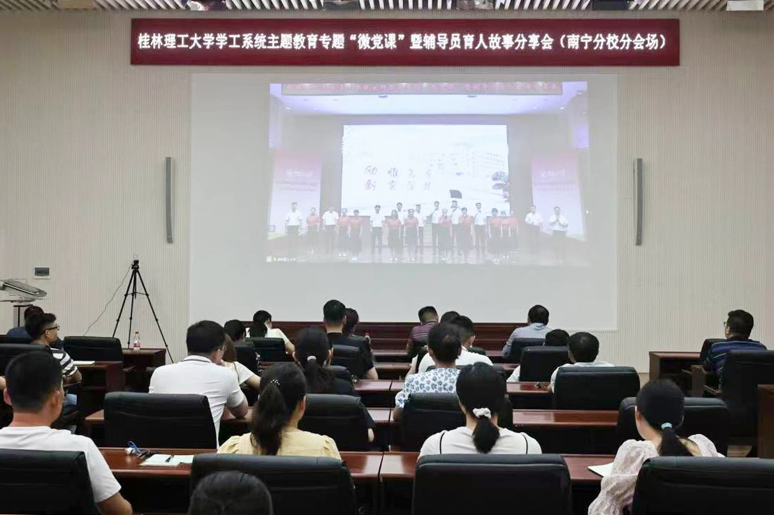为深入推进习近平新时代中国特色社会主义思想入脑入心,引导我校思想政治工作队伍进一步提高站位、聚焦主业,在干事创业中主动担当、用心作为,不断增强育人本领和履职能力,6月20日上午,学工系统主题教育专题“微党课”暨辅导员育人故事分享会在屏风校区图书馆报告厅召开。在家校领导邓军、王敦球、吴志强、韦学敏、邓国彬、曾繁荣,党委常委唐壮东、叶昊、邱杰,党委委员、校长助理辛立章,校长助理潘旦光出席会议。党办校办、学生工作部(处)、团委、研究生工作部、武装部(保卫处)、教务处、招生就业处、后勤集团等部门相关负责人,学生工作部(处)、团委全体工作人员,各学院分管学生工作的党委副书记,以及全体专兼职辅导员参加会议。南宁分校设视频分会场。