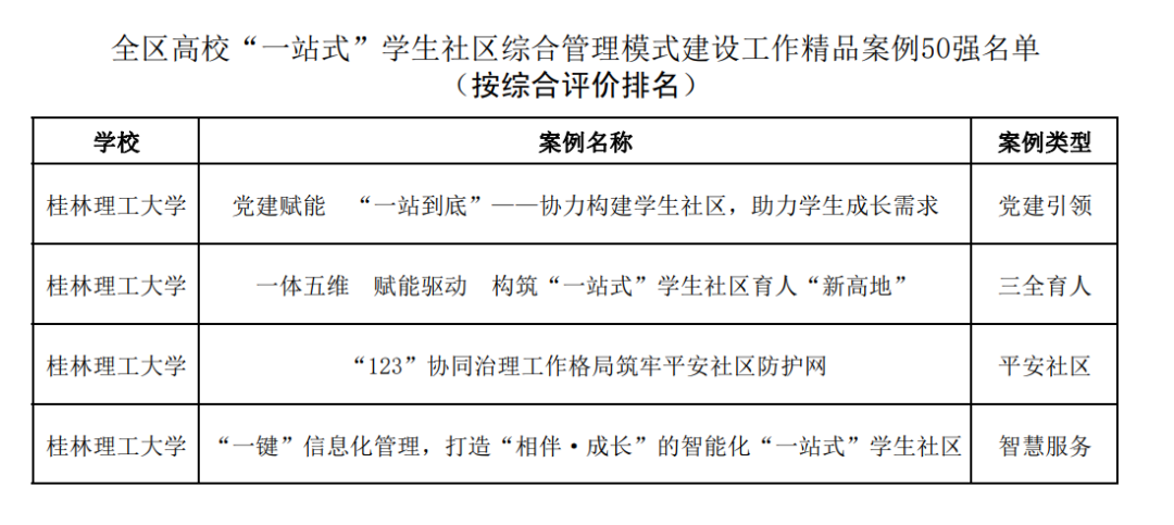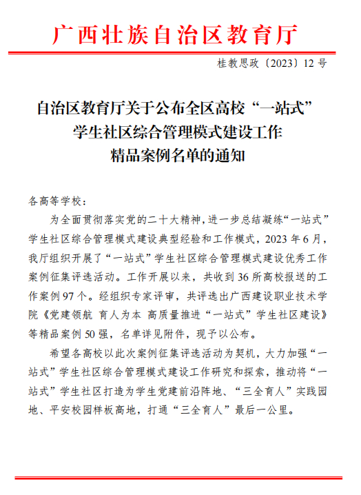 近日,自治区教育厅下发了《关于公布全区高校“一站式”学生社区综合管理模式建设工作精品案例名单的通知》,我校报送的党建引领、三全育人、平安社区、智慧服务4个工作案例均位列其中,是入选数量最多的高校之一。其中,《“一键”信息化管理,打造“相伴·成长”的智能化“一站式学生社区”》位列“智慧服务”版块第一,《一体五维 赋能驱动 构筑“一站式”学生社区育人“新高地”》位列“三全育人”板块第二。