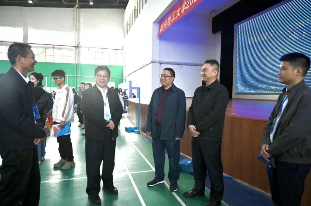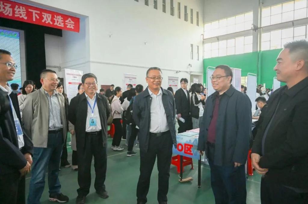 自治区教育厅一级调研员胡兆阳(左二)、学校校长王敦球(中)、学校党委副书记吴志强(左三)在双选会现场与用人单位交谈