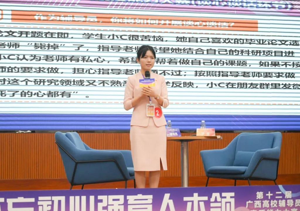 10月25日至27日,由广西壮族自治区教育厅主办、教育部高校思想政治工作队伍培训研修中心(广西师范大学)承办的第十二届广西高校辅导员素质能力大赛在广西桂林落下帷幕,共有来自区内各高校的92名辅导员参赛。经过激烈角逐,我校外国语学院辅导员梁璇、地球科学学院辅导员吴田波分别荣获第十二届广西高校辅导员素质能力大赛特等奖(第二名、第三名)。此外,外国语学院辅导员梁璇荣获案例研讨单项最佳表现奖、谈心谈话单项最佳表现奖;地球科学学院辅导员吴田波荣获案例研讨单项最佳表现奖。
