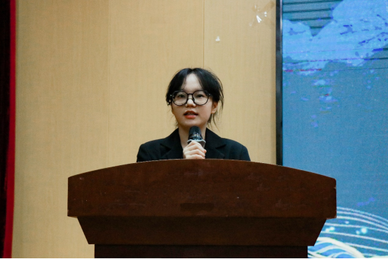 校易班第八届站长团成员梁燕发言。她在大会上致谢并分享了过去三年中砥砺奋进,共同成长的经历,对未来工作提出相关建议,并表示了对桂工易班“同舟共济创伟业,薪火相传向未来”的期望。