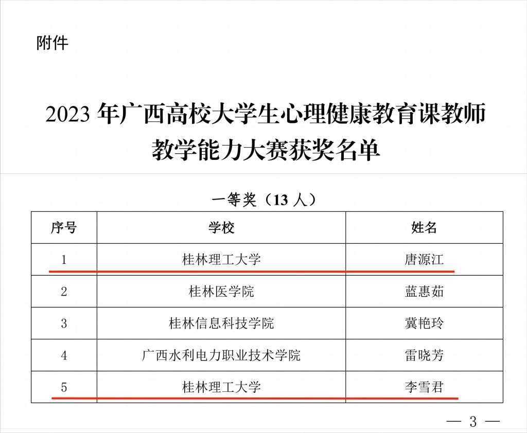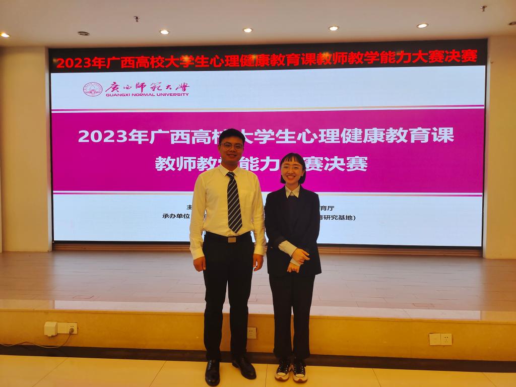 在由自治区党委教育工委、自治区教育厅主办,广西师范大学承办的2023年广西高校大学生心理健康教育课教师教学能力大赛决赛中,我校唐源江和李雪君两位老师均荣获教学能力大赛一等奖。