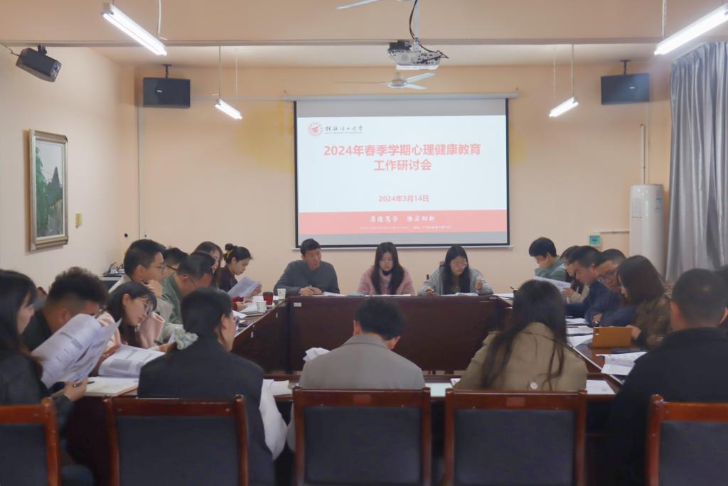 为推动落实立德树人根本任务,加强学校学生心理健康工作,提升学校学生心理健康素养,深入了解各学院心理健康教育工作现状,心理健康教育与咨询中心于3月14日下午在心理中心B303室召开了2024年春季学期学校心理健康教育工作研讨会,学生工作部(处)副部(处)长周明权出席本次研讨会,心理中心专职教师及各学院负责心理健康教育工作辅导员参加本次研讨会。