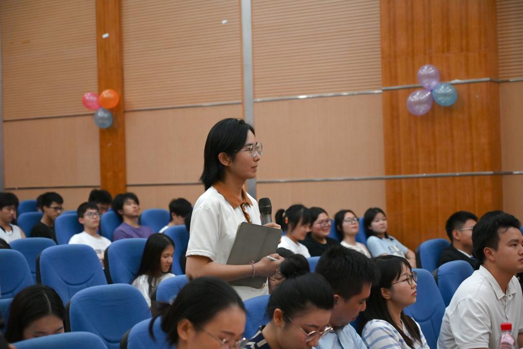 宣讲环节,3名宣讲团成员分别从不同专业、不同角度向同学们进行经验分享。测绘地理信息学院黄涛同学从“励学强志,筑自强之舱”“知行合一,扬使命之帆”“砥砺研思,立信仰之杆”三个方面,向同学们分享了学业科研、课外实践的成长感悟;机械与控制工程学院赵翩同学以“道阻且长,行则将至”为主题,分享了自己在学术、科研、实践等方面的成长历程,激励同学们用青春铺路,让理想延伸,实现自己的人生价值;公共管理学院刘英杰同学以“去尝试,去体验,去感受”为主题,分享获得国家奖学金的经验,鼓励同学们“明确目标、找准方向,坚定信念、勇于挑战”。互动过程中,现场气氛热烈,同学们踊跃提问,3位宣讲人就同学们关心的问题进行了细致耐心地解答。