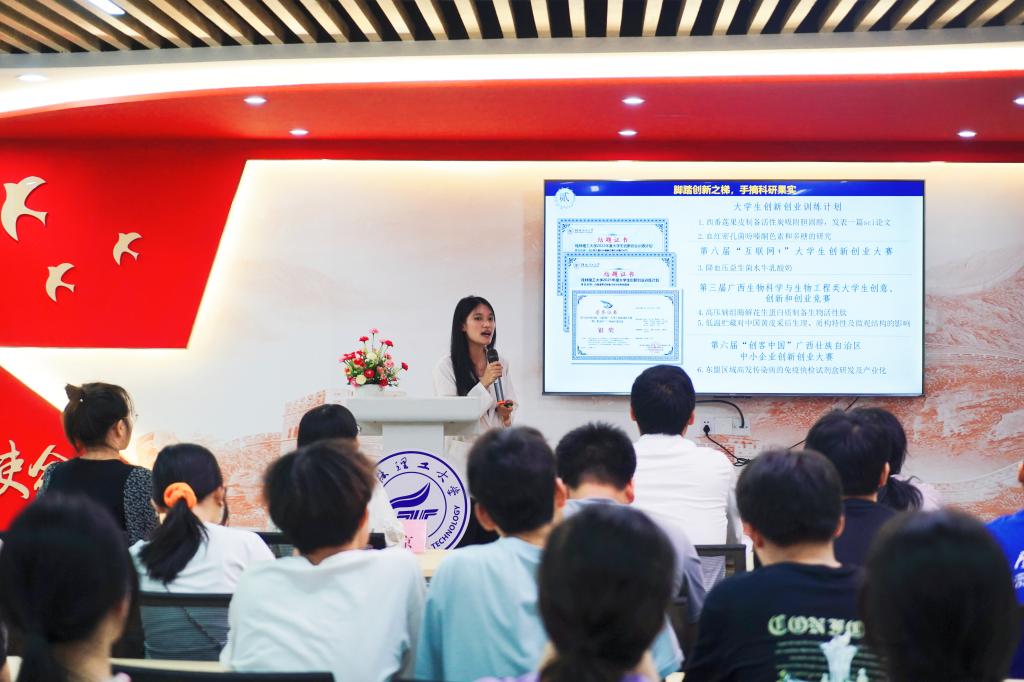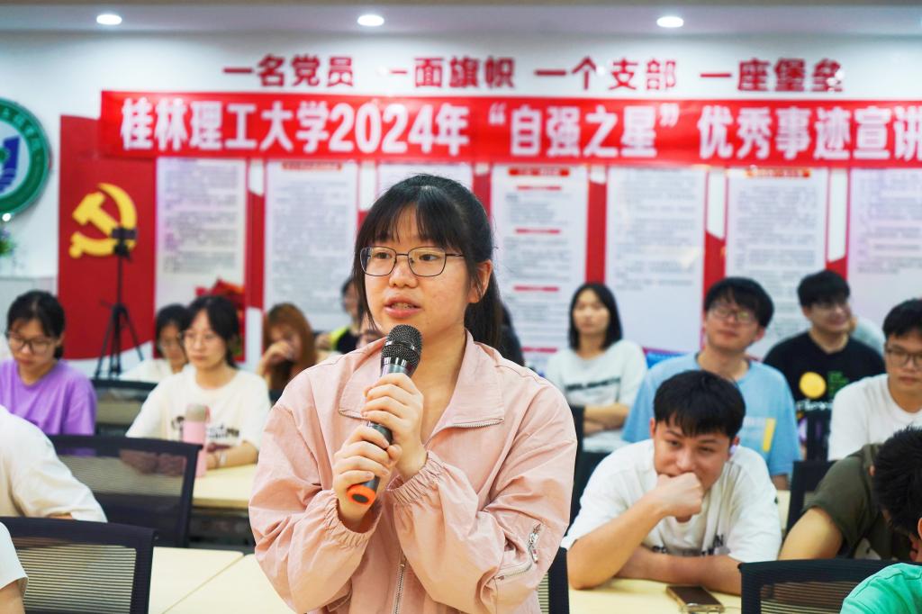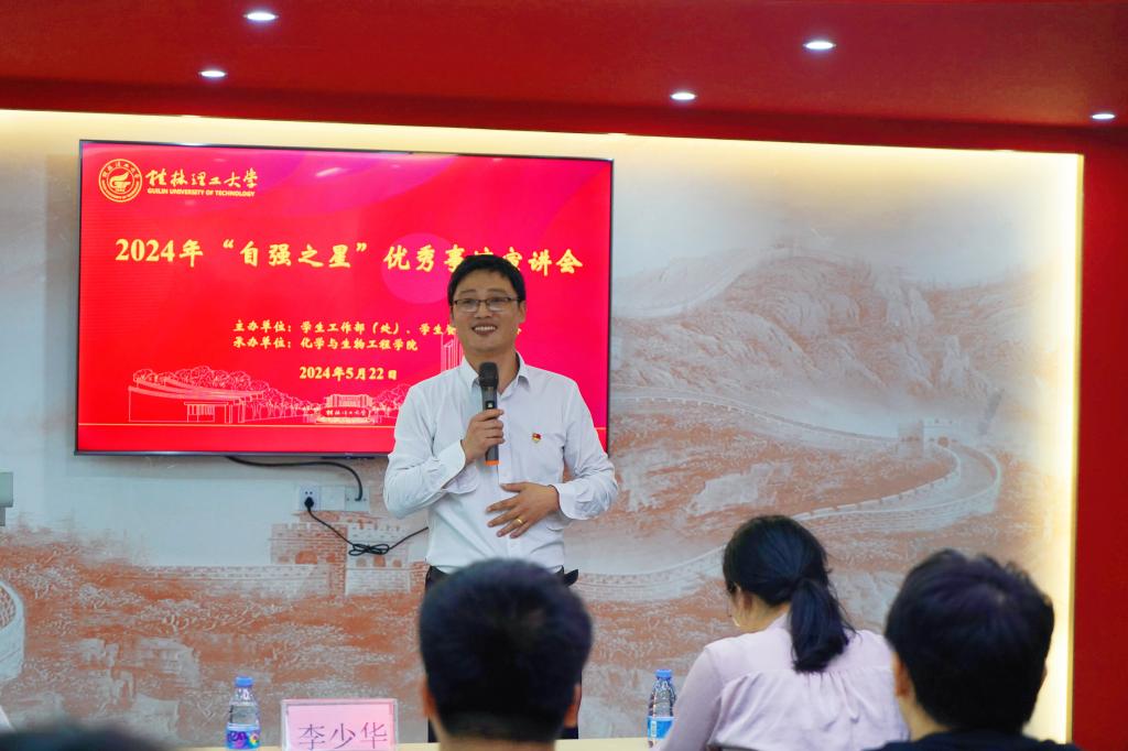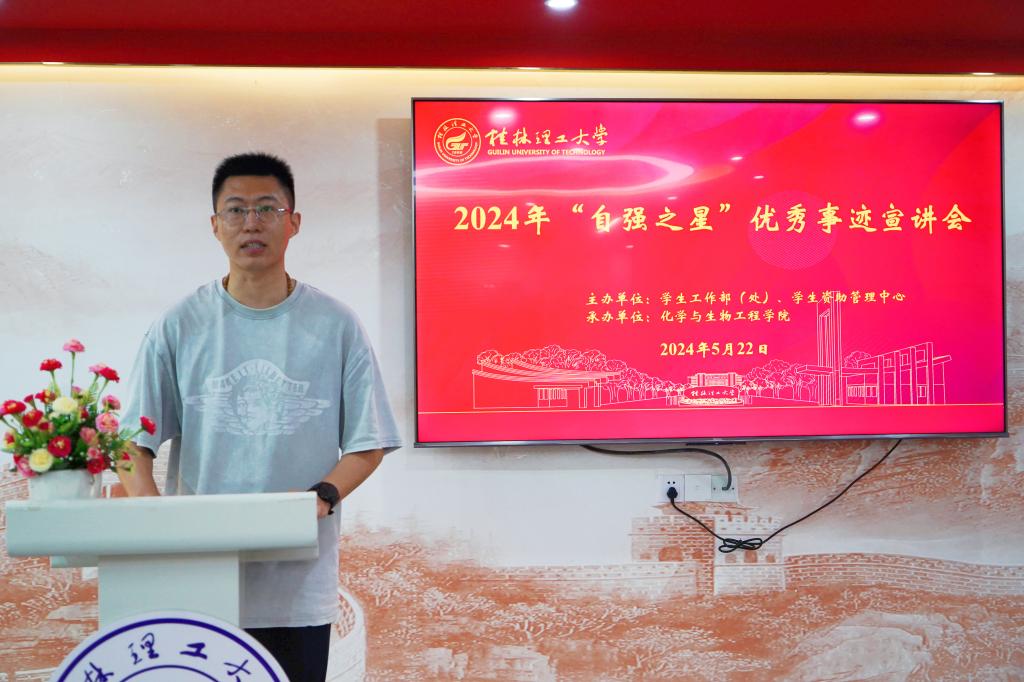 为充分发挥“自强之星”在大学生群体中的榜样引领作用,激励广大学子积极进取、自强不息,5月22日,由学生工作部(处)、学生资助管理中心主办,化学与生物工程学院承办的我校2024年“自强之星”优秀事迹宣讲会(第三期)在雁山校区“明园”一站式学生社区顺利举办。化学与生物工程学院党委副书记李少华、学生工作部(处)学生资助工作办公室干部、相关学院资助工作辅导员以及70余名学生代表到现场观看宣讲。