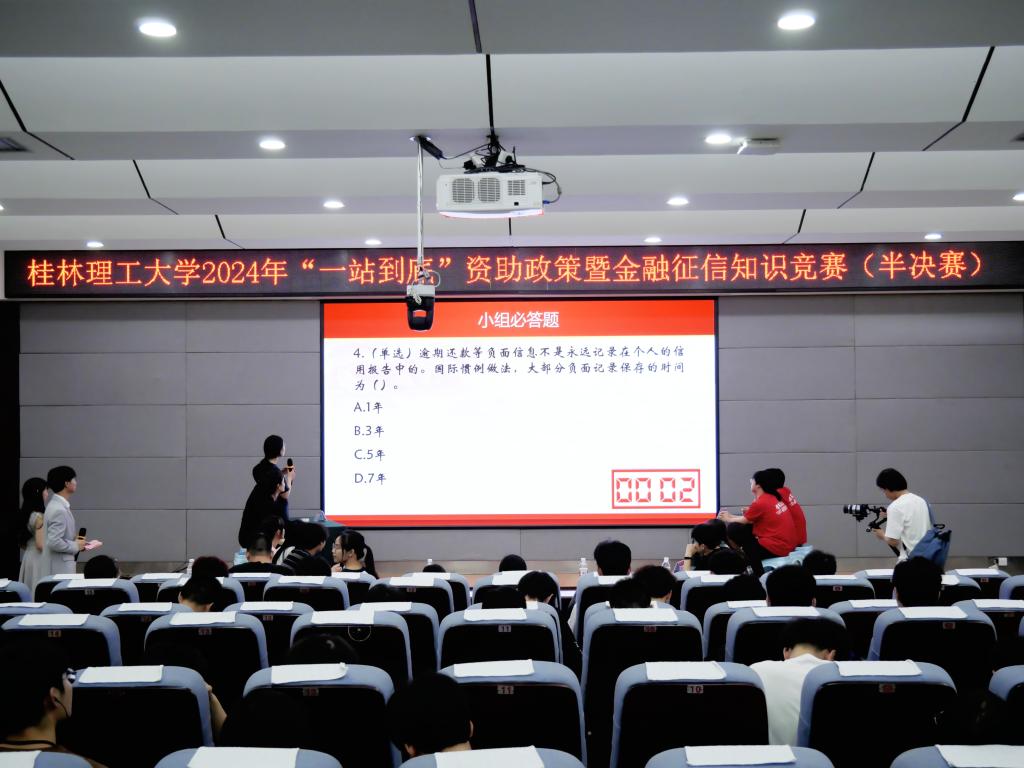 为进一步加大学生资助政策宣传力度,普及金融征信知识,增强广大学生的感恩和诚信意识,激励学生奋发自强,立志成才,5月28日晚,由学生工作部(处)、学生资助管理中心主办,环境科学与工程学院、材料科学与工程学院承办的2024年“一站到底”资助政策暨金融征信知识竞赛(半决赛)在雁山校区逸夫楼501报告厅顺利举办,学生工作部(处)学生资助工作办公室干部、各学院资助工作辅导员以及200余名学生代表到现场观看比赛。