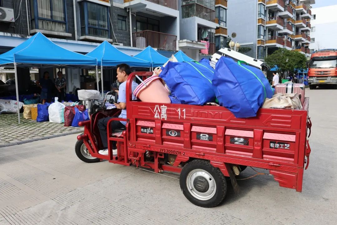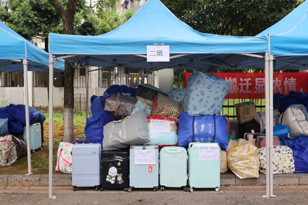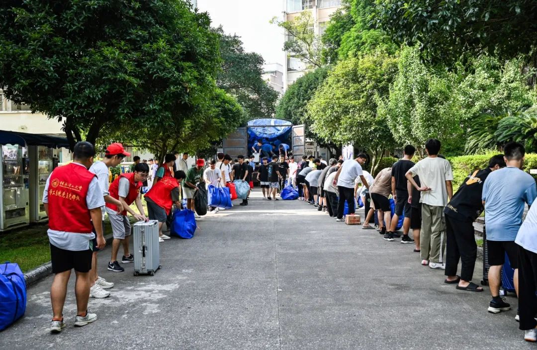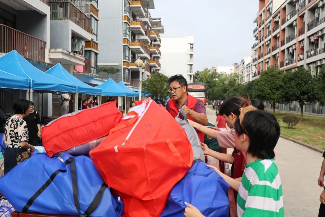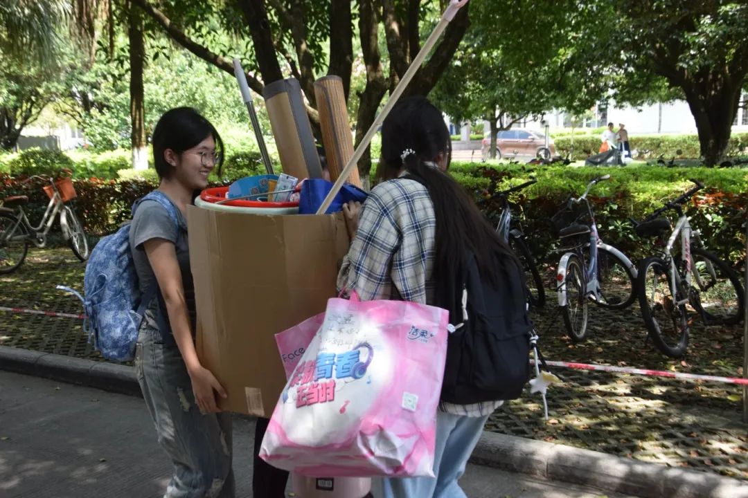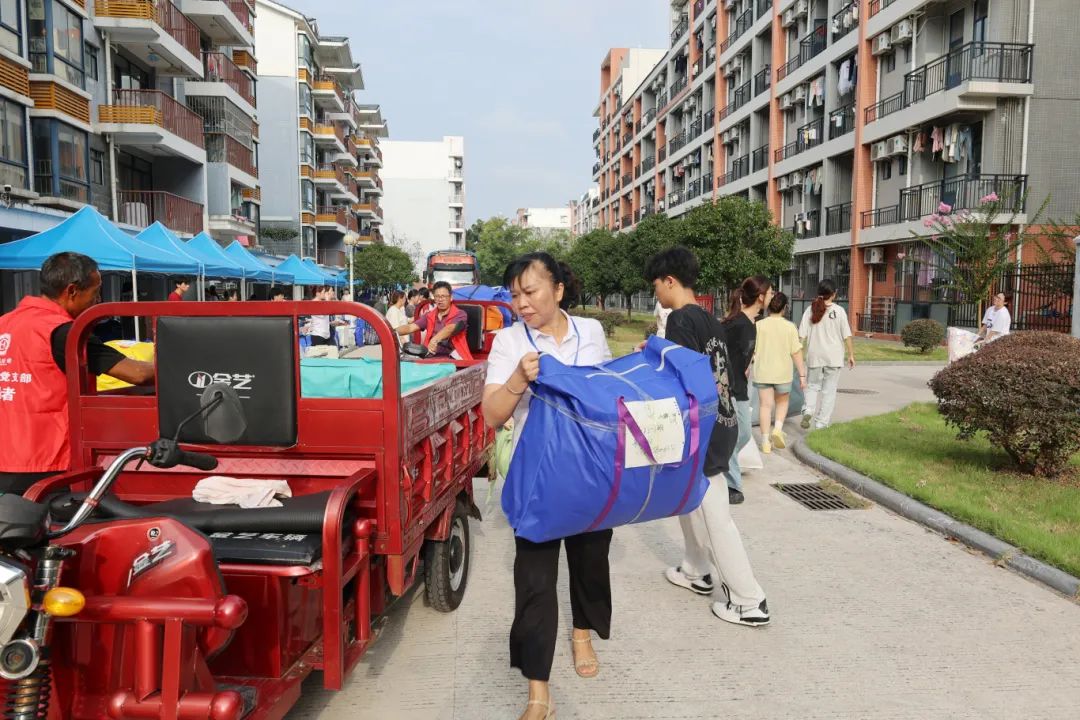 在搬迁过程中,相关职能部门领导干部、相关学院主要负责人、辅导员、班主任、医疗、保卫、后勤人员以及学生志愿者等紧密配合、有序推进。在搬迁现场,到处充满着温馨和谐的气氛,学校根据宿舍分布情况,合理安排各学院学生分批分时段搬迁,确保各批次学生入住“无缝对接”;学校在两校区内搭建100余顶防雨防晒帐篷,设置了客车、货车停靠点及行李集中存放点,并为学生提供“爱心小推车”“暖心三轮车”“免费饮用水供应点”等系列服务;同时,食堂还适当提前和延后营业时间,满足搬迁学生就餐需求;校医院在两校区设置了临时医疗服务点,为学生安全保驾护航;相关学院充分发挥学生党员和学生骨干先锋模范作用,成立搬迁工作志愿服务队,为搬迁学生提供秩序维护、入住登记、搬运行李等志愿服务,有力地确保了搬迁工作圆满完成。