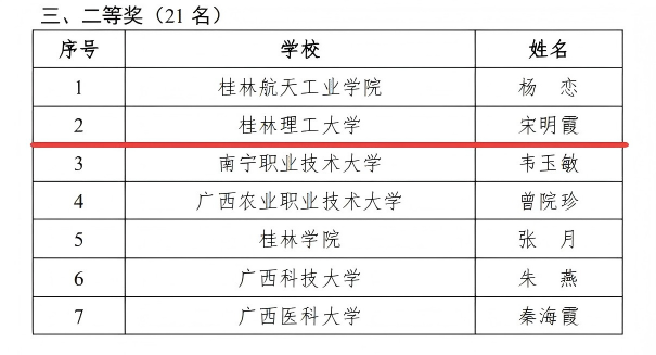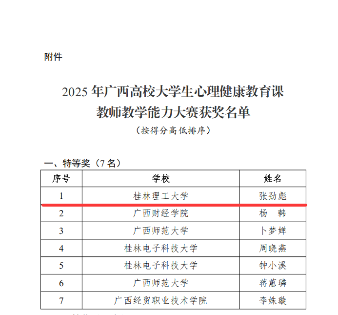 近日,自治区教育厅公布2025年广西高校大学生心理健康教育课教师教学能力大赛获奖名单,我校参赛教师张劲彪获得大赛特等奖第一名,宋明霞获得大赛二等奖。