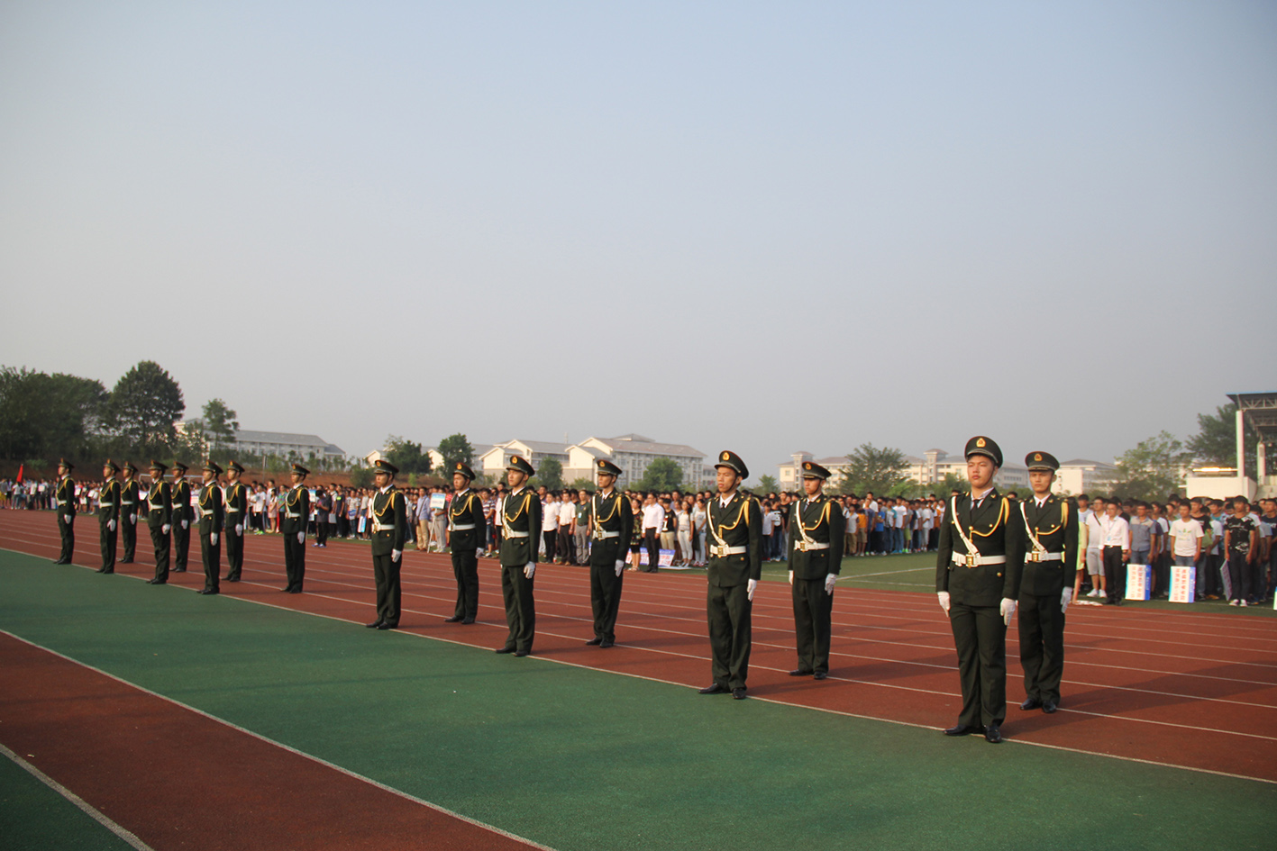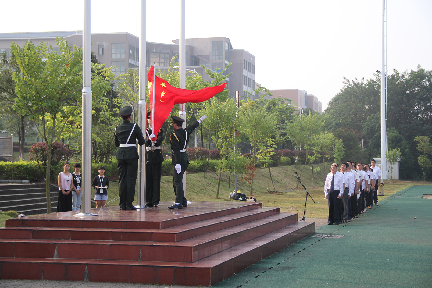 在全校师生的注目礼下,英姿飒爽的国旗护卫队队员们迈着整齐的步伐,护送鲜艳的五星红旗进场。伴随着庄严雄壮的中华人民共和国国歌的奏响,鲜艳的五星红旗缓缓升起,全场师生肃立,凝视着飘扬升起的五星红旗,表达对祖国无限的热爱和崇高的敬意。