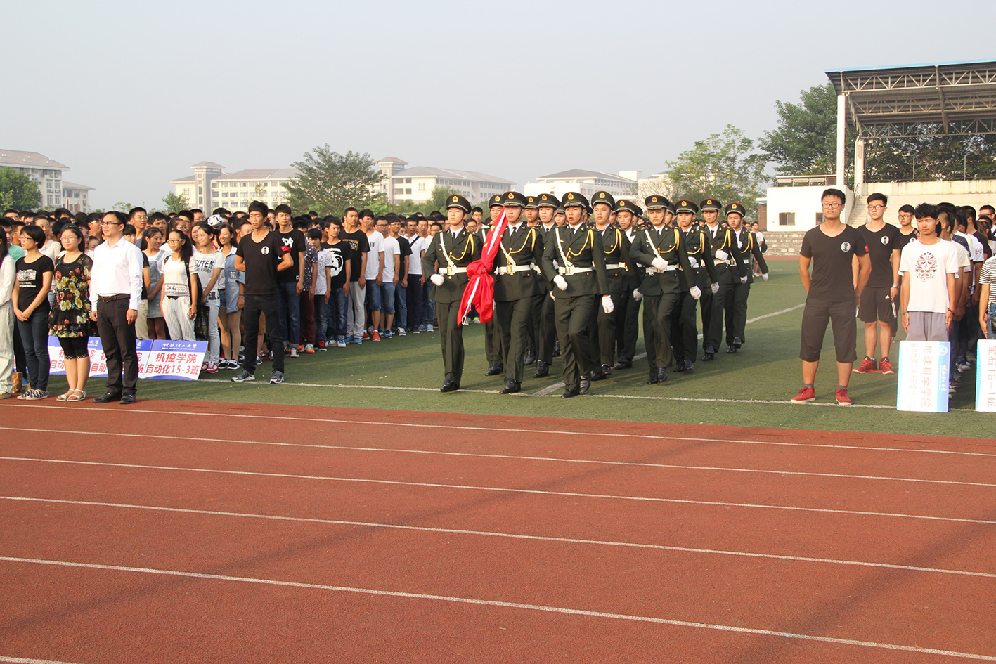 在全国上下共同庆祝伟大祖国66岁生日之际,10月1日早上8时整,我校在雁山校区足球场隆重举行庆国庆升国旗仪式。学校副厅级调研员张劲松出席升旗仪式并发表讲话,学生工作处、校团委全体人员,研究生院、各学院学生工作负责人,2015级新生辅导员,雁山校区全体在校学生参加升旗仪式。仪式由学生工作处处长唐壮东主持。