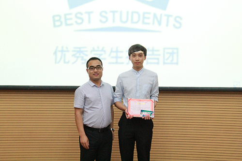 学工处副处长马秀明为最佳人气奖获得者赵博颁奖