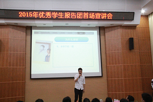 为激发同学们的学习热情,营造学习典型、追求卓越的良好学风,5月5日晚,由学生工作部(处)主办、学生工作助理中心承办的2015年优秀学生报告团首场宣讲会在萃华楼报告厅顺利举行。学生工作部(处)副部(处)长金飞、马秀明出席宣讲会并做重要讲话,学工处、部分学院辅导员以及校级组织负责人参加了此次宣讲会。
