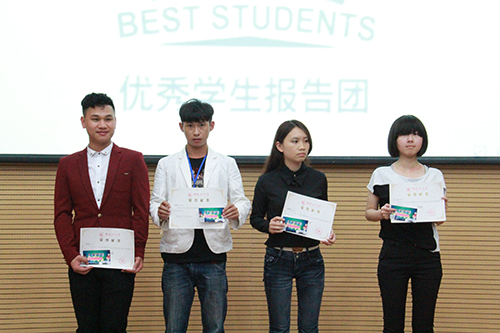 大会在优秀学生报告团成果展视频播放中徐徐拉开序幕。报告中,考研牛人周启航的幽默风趣、实践达人张美泉的感人至深、学霸超人陈曦的清新淡雅、绝技高人赵博的侃侃而谈,以各自不同的方式,向同学们分享自己的优秀经历,几位辅导员针对性的点评让优秀深化进入每个聆听者内心。经过激烈的投票拼人气环节,赵博同学将“最佳人气奖”揽于怀中。会中,会徽设计一等奖获得者韦福瑞同学向大家阐述了其报告团会徽设计的理念,加深了在场人员对优秀学生报告团的理解。