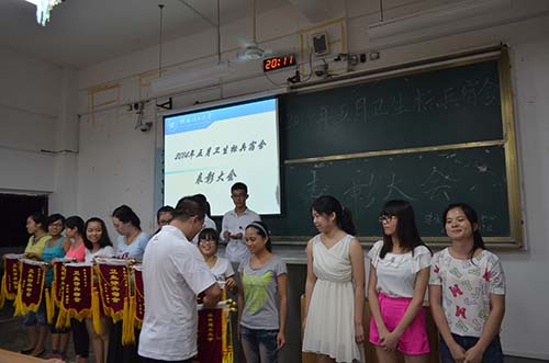 为进一步加强学生宿舍文化建设,加大对学生行为养成教育力度,在宿舍园区形成一批安全、文明、卫生典型,形成具有一定特色的宿舍卫生文化,6月17日晚,由学生工作部(处)、后勤处联合主办的卫生标兵宿舍创建活动正式启动。各相关社区指导老师、学生工作助理中心、校、院两级学生会相关负责人和学生宿舍代表160余人参加了活动。 会上,主持人宣读了两校区60间首批每月(5月)卫生标兵宿舍名单,在热烈的掌声中,出席活动的老师为这些宿舍授予了“卫生标兵宿舍”流动红旗。学工处陈小波老师对首批获得流动红旗的宿舍表示了祝贺,希望相关宿舍切实起到带头作用,引领广大同学积极参与卫生宿舍的创建,并就卫生标兵宿舍创建活动的相关方案进行了简要说明。