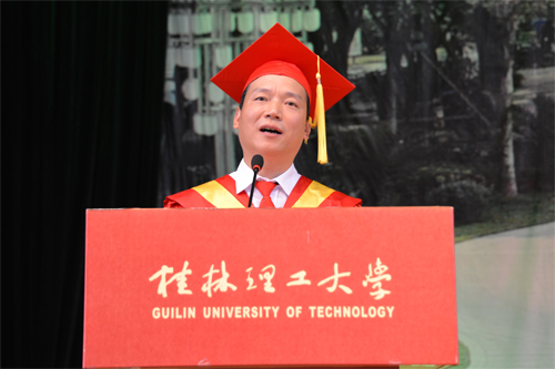 解庆林校长代表学校党委、行政向全体毕业生表示热烈祝贺,并向辛勤做好三育人工作的全体教职员工表示衷心感谢。他说,几年前大家怀揣着对知识的渴望,从全国各地来到美丽的雁山、屏风山脚下,老师们的谆谆教诲启迪了同学们的心智,桂林的秀水滋润了同学们的心田,日积月累的拼搏增强了同学们的自信,在桂工校园里留下的青春记忆,将成为大家珍藏一世的宝贵财富。临别之际,作为校长、老师和朋友,他送给全体毕业生六个字:立德、立行、立功。他深情嘱咐毕业生:“立德”,就是要有好的品德,在平时工作生活中,不断锤炼个人品德,加强自身修养,面对复杂的社会现象学会冷静观察、深入思考、慎重抉择;“立行”,就是要在实干中成长,在新的人生征程中脚踏实地,从具体工作做起,从基层做起,在实干中成就梦想;“立功”,就是要在实现中华民族伟大复兴的历史进程中建功立业,牢记自己是“桂工人”,发扬“艰苦创业、敬业奉献、团结协作、开拓创新”的桂工精神,勤奋工作,甘于奉献,在服务祖国、服务人民的过程中实现人生追求。最后,他希望同学们记住我们共同的名字——桂工人,“一朝桂工人,一生桂工情”,无论同学们身处何方,无论时光相隔多久,英国上市公司365永远是大家的坚强后盾和精神家园!