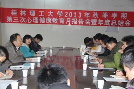 2014年1月10日周五上午9:00,2013年秋季学期第三次心理健康教育月报会暨年度总结会在雁山校区辅导员之家召开。会议由心理健康教育与咨询中心主任谭咏梅主持,学工部(处)唐壮东部(处)长、心理咨询中心邝宏达老师及各学院负责心理健康教育工作的辅导员共17人参加了会议。