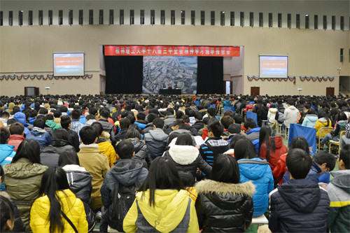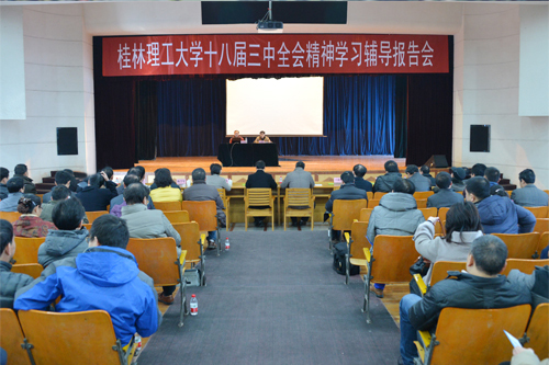 当天晚上,朱革新教授还在雁山校区风雨体育馆为我校学工干部、辅导员以及2000余名学生作了十八届三中全会精神学习辅导报告。