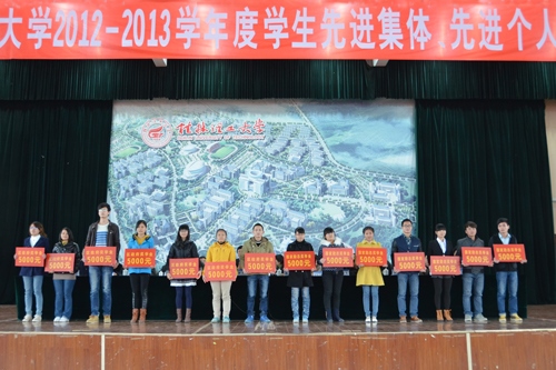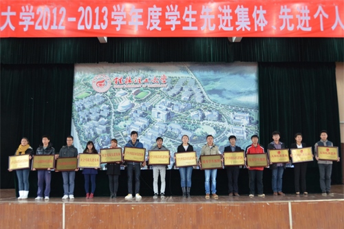 大会在庄严的国歌声中拉开帷幕。梁福沛副校长宣读《2012-2013学年度国家级、自治区、校级学生先进集体、先进个人表彰决定》,在主席台前排就座的领导为2012-2013学年度学生先进集体和先进个人代表进行颁奖。化学与生物工程学院化学工程与工艺10-1班陈鹏同学和人文社会科学学院行政管理10-1班晶鑫同学分别代表先进集体、先进个人发言,向辛勤培育他们的老师表示衷心的感谢,并表示今后将加倍努力学习,以更加优异成绩回馈学校的悉心培养。