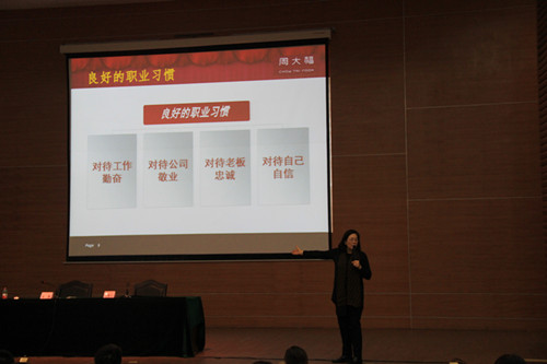 2013年11月6日晚,周大福珠宝金行策略合作伙伴关系总经理刘璞女士一行应邀来校,在屏风校区图书馆报告厅做题为《提升个人素质,塑造完美团队》的讲座。学生工作部(处)张雷副部(处)长和周大福奖学金受助学院学生代表参加了讲座。
