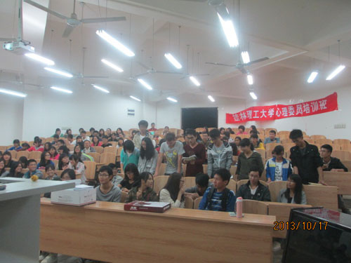 2013年10月17日晚,我校2013级班级心理委员培训班在雁山校区07519教室顺利开班。培训共有两个主题,分别是《班级心理委员如何开展工作》、《班级团体心理活动组织要领》,由邝宏达老师主讲。