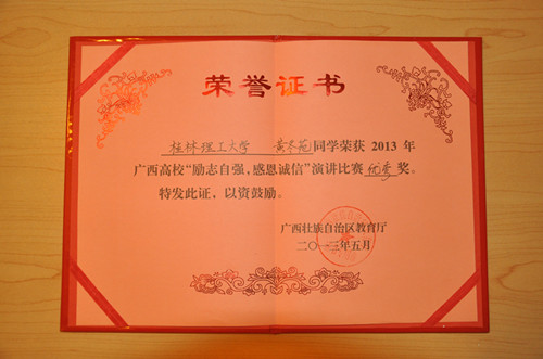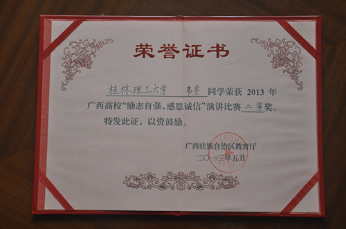 日前,广西高校“励志自强,感恩诚信”演讲比赛决赛结果揭晓。我校材料科学与工程学院2012级韦宇同学凭借着扎实的演讲技巧沉着应战,在决赛过程当中表现出色,脱颖而出,获得了全区总决赛二等奖的好成绩。测绘地理信息学院2012级黄冬苑同学获得了优秀奖。