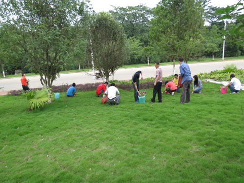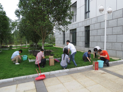为积极响应自治区关于开展“美丽广西 清洁乡村”和学校关于开展校园环境卫生整治活动的号召,2013年5月21日下午,学工处、团委组织全体干部在雁山校区开展卫生和绿化责任区保洁活动。