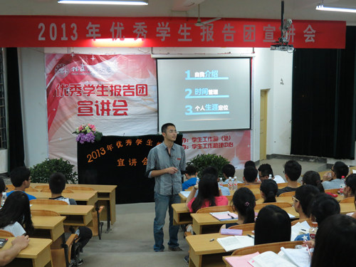 5月21日晚,由学工部(处)主办,学生工作助理中心承办的2013年优秀学生报告团宣讲会第一场在雁山校区05307与05308两个教室同时举行。学工处思想教育科张萌萌老师、心理咨询中心王云飞老师以及在雁山的全体报告团新老成员一同聆听了新一届报告团同学的精彩宣讲活动。