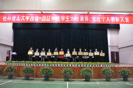 12月26日下午,学校在雁山校区体育馆隆重举行2011-2012年度先进集体、先进个人表彰大会,共有39个先进集体、千余名先进个人受表彰。校长解庆林、校党委副书记王赣华,副校长吴志强出席会议。学工处、教务处、校团委负责人,各学院党委书记或院长、副书记、辅导员、获奖学生及学生代表等参加了此次大会。