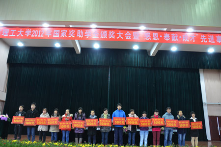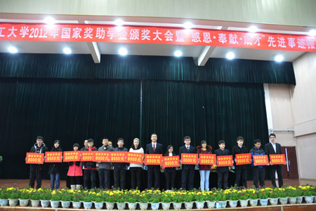 大会在庄严的国歌声中拉开帷幕。首先,学校学工处处长熊英介绍2011—2012年度国家奖助学金审评情况。随后,在前排主席台就座的领导为国家奖助学金获得者颁发了奖金。