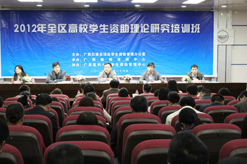 为了进一步提高全区学生资助管理人员队伍的整体素质,增强全区学生资助管理人员队伍的资助理论研究能力和业务管理能力,更加科学地、全面地落实高校家庭经济困难学生资助政策,11月26日至28日,由自治区学生资助管理办公室主办、广西教师培训中心承办、广西医科大学学生资助管理中心协办的全区高校学生资助理论研究培训班举办。自治区教育厅巡视员林宁、自治区学生资助管理办公室主任农汉康、副主任全斌,区内外高校的资助理论研究专家,以及全区高校学生资助管理部门负责人、老师参加了本次培训。