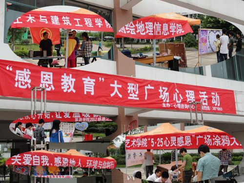 2012年5月25日,由心理健康健康与咨询中心主办,各学院承办的以“学会感恩,健康成长”为主题的现场心理健康教育活动在雁山、屏风两校区成功举办。