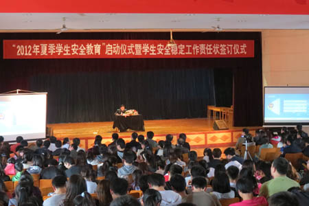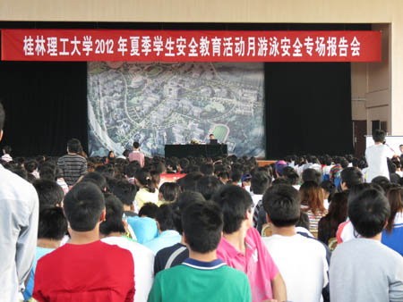 为扎实推进我校夏季学生安全教育月工作,建立健全安全防范工作机制,强化学生守纪自律意识和安全保护意识,切实提高学生防范避险和应急处置能力,我校于4月9日至4月12日分别在屏风、雁山两校区举行了4场题为“珍爱生命、预防溺水”的游泳安全专场报告会,本次报告的主讲人为桂林市公安局漓江分局林敏副局长。学校党委王赣华副书记全程出席报告会,屏风、雁山两校区1万多名学生和各学院学工人员共同听取了报告。