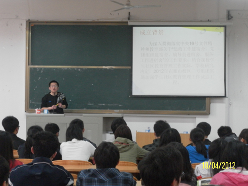 会上,汪晟老师从学生社区教育管理工作试点工程启动的背景、学生组织的定位和职能分工、近期工作安排和工作要求四个方面给学生干部们培训,希望学生干部能够充分发挥才智,共同促进试点社区的发展和进步。