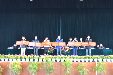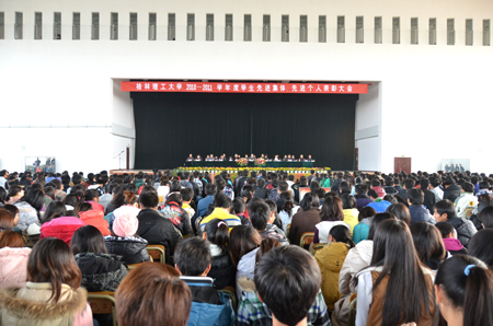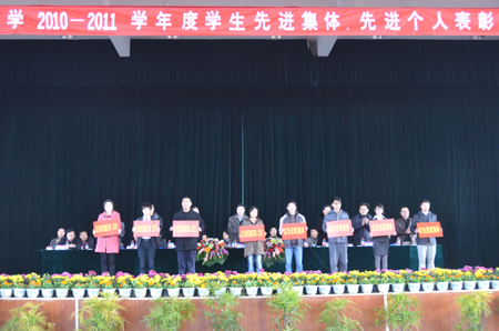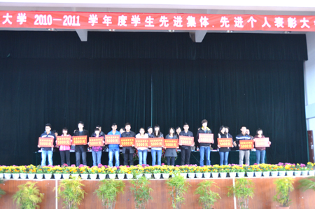 12月22日下午,学校在雁山校区体育馆隆重举行2010-2011学年度先进集体、先进个人表彰大会。校党委副书记王赣华,副校长陈学军、吴志强出席会议。党(校)办、宣传部、学工处、教务处、后勤集团、校团委负责人,各学院党委书记或院长、副书记、辅导员、获奖学生及学生代表等参加了此次大会。大会由学工处处长熊英主持。