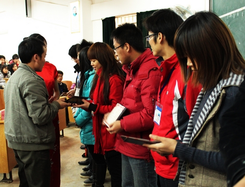 下午14时30分,针对服务公司上岗人员的培训正式开始,与上午不同的是,首先进行的是2010-2011学年度勤工助学干部和勤工助学礼仪队聘书的颁发仪式,由农老师宣读上一学年度的受聘人名单,随后宋老师、伍老师、农老师、现任副主任和副经理,依次为获得聘书的同学进行颁奖。接着由宋老师、伍老师、农老师分别进行了心理健康、礼仪和勤工助学简介的培训。