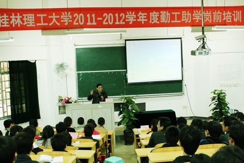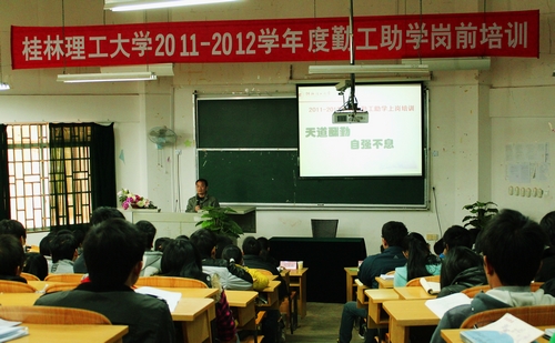 12月10日,我校2011-2012学年度勤工助学岗前培训在雁山校区05103教室隆重举行,培训由学工处勤工助学办公室主任兼经理农庆能老师主持,并邀请学工处心理咨询中心主任宋明霞老师和心理咨询中心伍开明老师对勤工助学在岗人员进行心理健康和礼仪的培训。