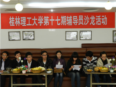10月26日下午,我校第十七期辅导员沙龙活动在雁山校区雁园举行,此次沙龙活动以“2011年暑期辅导员家访活动交流总结”为主题,校党委王赣华副书记、学生工作部(处)熊英部(处)长、校团委周国桥副书记及各学院参与家访活动的辅导员代表、校学生资助管理中心全体人员参加了此次活动。