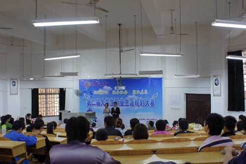 2011年9月24日上午9点,我校第二届大学生职业生涯规划大赛在雁山校区05103教室顺利举行。招生就业处副处长范玲老师、地球科学学院党委副书记耿俊茂老师、学生工作处思想政治教育科科长欧阳胜权老师、勤工助学办公室主任农庆能老师及心理健康教育与咨询中心主任宋明霞老师共同担任了本次大赛的评委,校团委副书记白凌婷老师也出席了本次大赛。