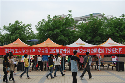为使广大同学进一步深入了解国家学生资助政策,强化责任意识和感恩意识,4月21日,由我校学生资助管理中心主办的 “学生资助政策宣传月” 活动之班级资助政策手抄报比赛在我校雁山校区食堂门前小广场隆重举行。本次活动的主题是宣传和普及党和国家资助政策及实施成效。