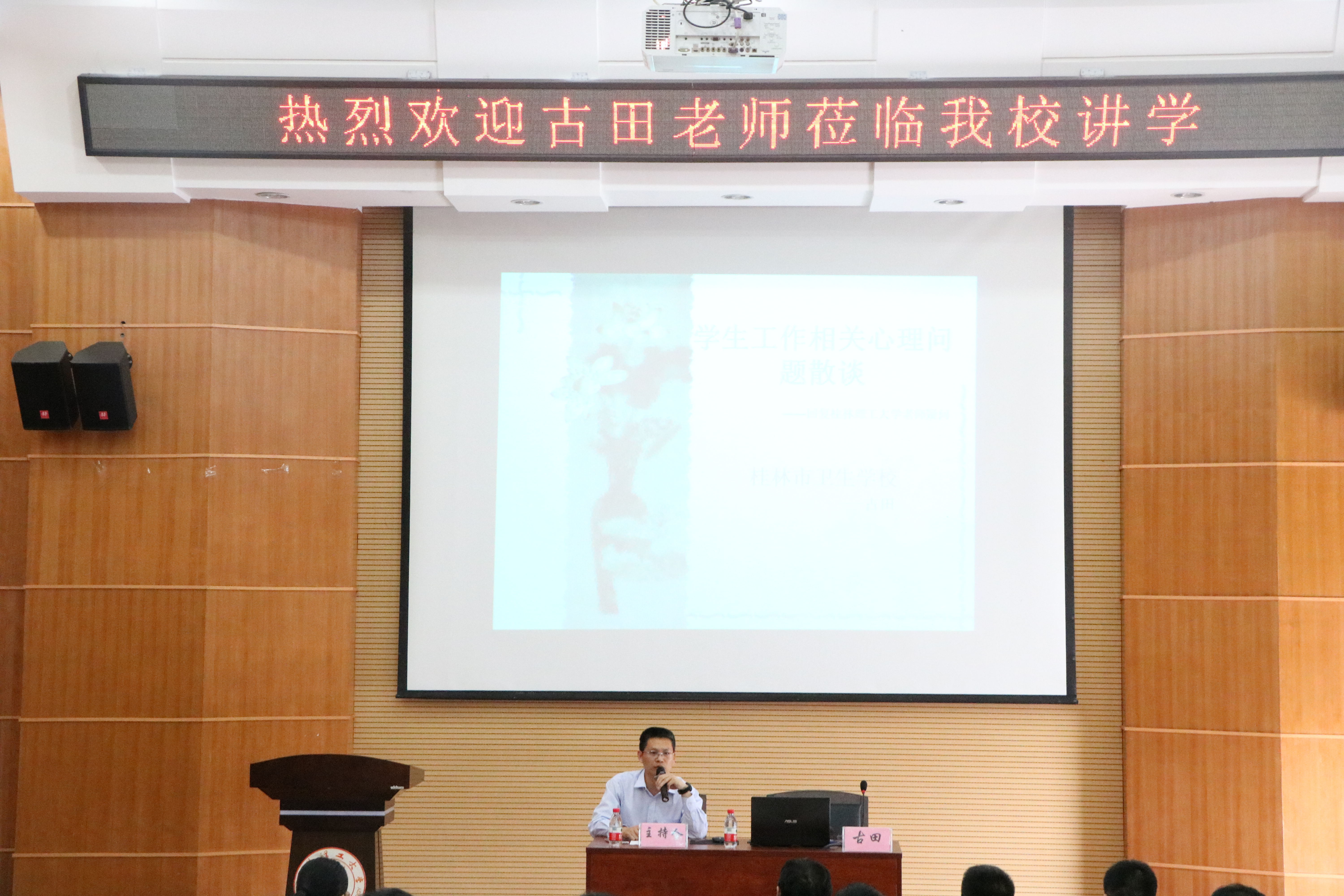 2017年4月20日下午,桂林市卫生学校教师、原桂林市社会福利医院医学心理科主任古田老师应邀到我校进行题为《学生工作相关心理问题散谈》的讲学,讲座由学工部(处)副部(处)长冯广辉主持,学工部(处)副处长代武社、处长助理郑伟民、宣传部副部长欧阳胜权、各学院党委副书记和学生工作系统以及博文学院的老师参加了本次讲座。