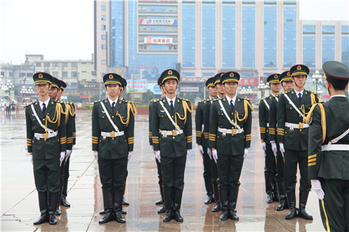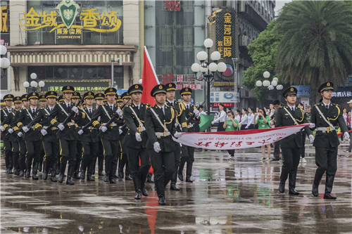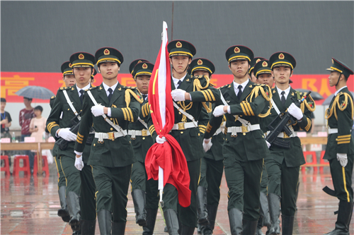 立正稍息、整理着装、整齐报数、跨立转向、齐步走正步走……身着整齐“军装”的我校国旗班队员们,在现场市民的注视下,整齐划一地做着各种动作,每个动作反应迅速、干脆利落,每个步伐坚定从容、铿锵有力,即使面对风雨的洗礼,国旗班成员们依然整齐、规范的完成着各种比赛队列,他们不畏风雨的精神感染了在场的每一位市民,此次竞赛展现了桂工学子昂扬向上的精神风貌和青春风采;