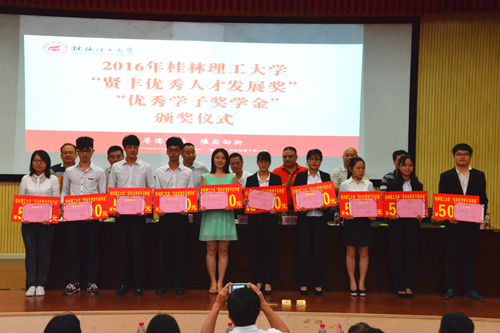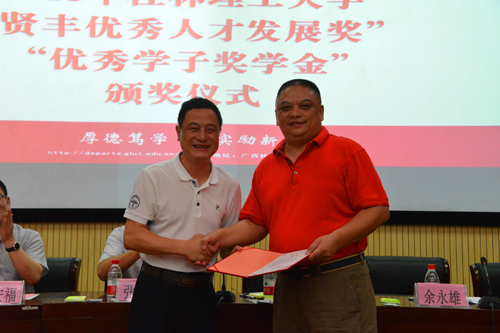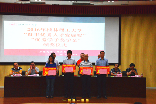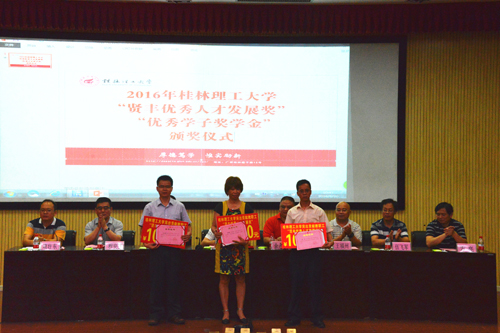 6月20日上午,2016年“贤丰优秀人才发展奖”、“贤丰优秀学子奖学金”颁奖仪式在雁山校区图书馆报告厅举行。广东贤丰矿业集团有限公司董事、中贤公司总经理余永雄,学校副厅级调研员张劲松出席仪式。党(校)办、校友办、学工部(处)、人事处、招就处、科技处负责人,各学院党委副书记、辅导员、学生代表和全体获奖人员参加了仪式。