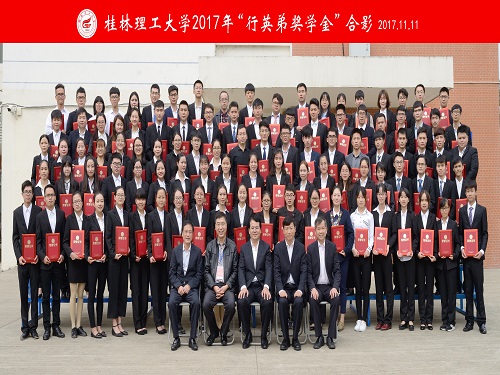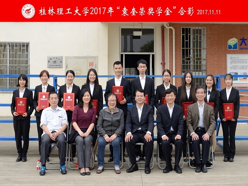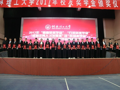 11月11日上午,正值我校诞辰61周年之际,我校在雁山校区综合体育训练馆举行2017年“校友奖学金”的颁奖仪式。学校党委书记李国忠、校长解庆林、副校长陈学军、副厅级调研员张劲松出席了本次颁奖仪式,袁奎荣夫人邓燕华教授及女儿袁雁女士,奖学金捐赠人我校校友行英弟、付灵君、“袁奎荣奖学金”基金管理委员会代表、各地及行业校友会代表;校办、校友办、宣传部、学工部(处)、校团委、研究生工作部负责人、各学院校友会负责人,各学院党委副书记、辅导员代表,获奖学生及学生代表2200多人。仪式由学校副校长陈学军主持。