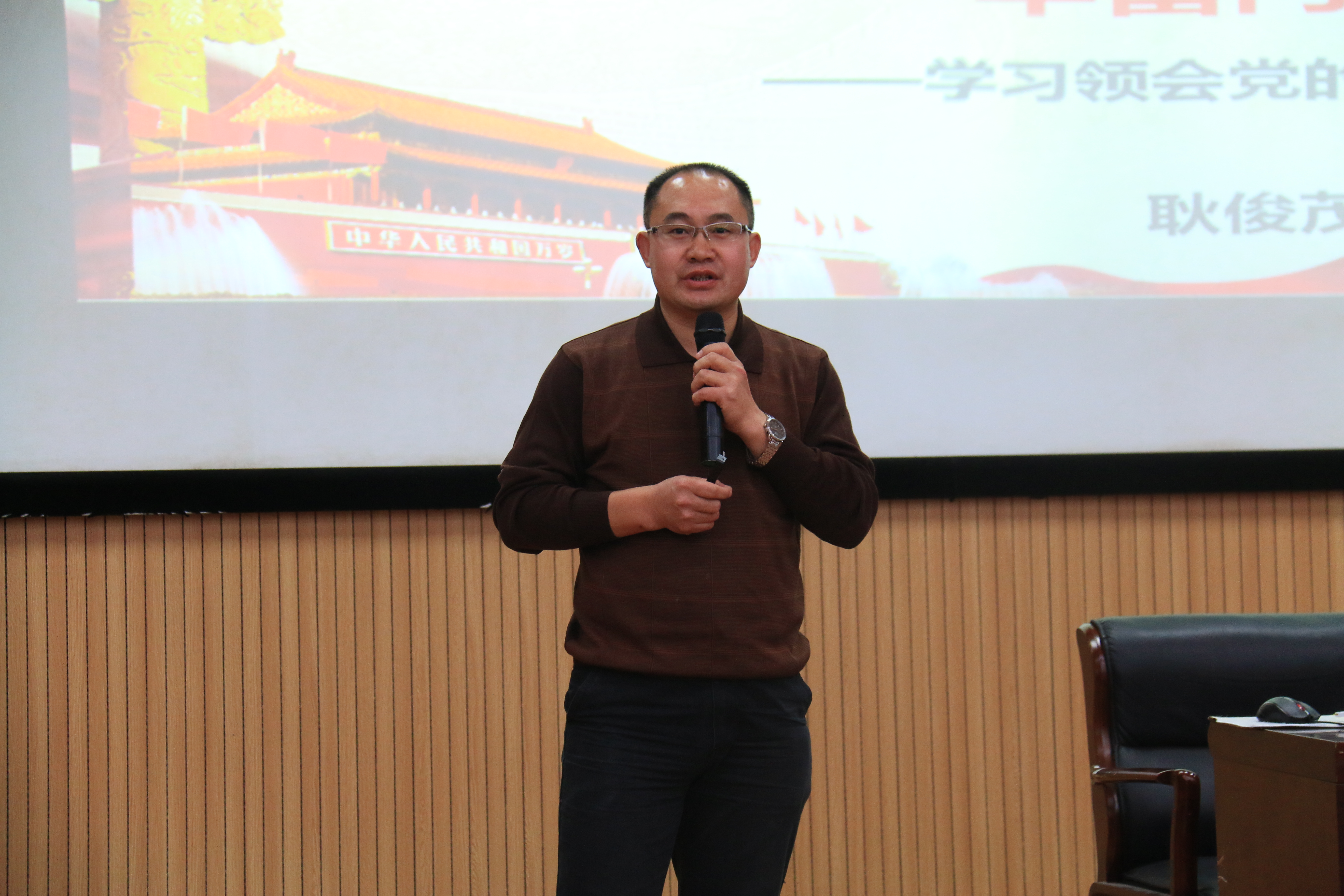 耿俊茂副书记以《习近平新时代中国特色社会主义思想丰富内涵——学习领会党的十九大精神》为题,向各位同学展示了新时代中国特色社会主义的深刻变革、伟大实践、理论指导、基本方略、战略安排、行动纲领和坚强领导这七个方面的知识。列举了党带领全国各族人民在过去五年取得的十个方面的重大成就和鲜明特点,阐述了“四个伟大”的内涵及其相互关系,解读了习近平新时代中国特色社会主义思想“八个明确”和“十四条基本方略”,分析了党对社会主义现代化建设作出战略安排的“两个阶段”以及推进全面从严治党的战略部署。