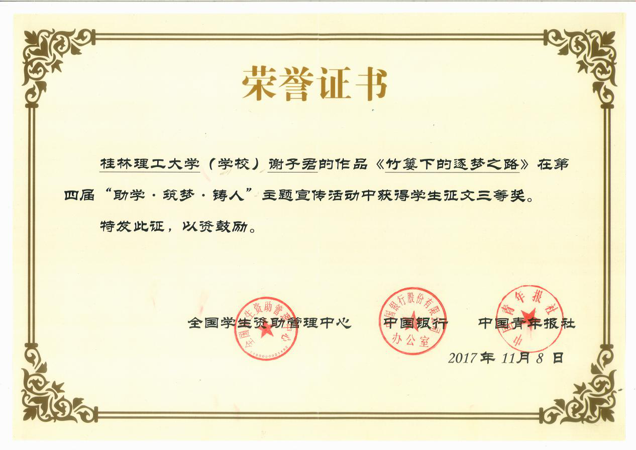 近日,第四届“助学·筑梦·铸人”主题宣传活动结果揭晓,我校学子在此次宣传活动主题征文比赛中喜获佳绩,旅游学院2015级谢子君同学的文章《竹篓下的逐梦之路》荣获全国三等奖。