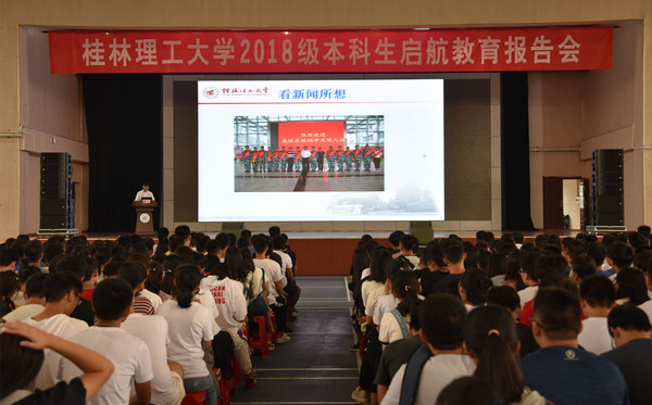 新生入学教育在学生由中学生向大学生的转变过程中起着重要的作用,肩负着引导帮助新生完成心理转型与重塑、适应高等教育特点、融入大学生活的重要使命,同时新生入学教育也是高校思想政治教育工作的重要内容之一。为引导2018级新生尽快适应大学学习和生活,9月10日上午,我校在雁山校区体育综合训练馆开启“新生启航计划”系列入学教育。学校校长解庆林为全体2018级新生作了题为“弘扬‘桂工精神’,志存高远,立志成才!” 的首场入学教育报告。报告会由学校党委副书记王赣华主持。